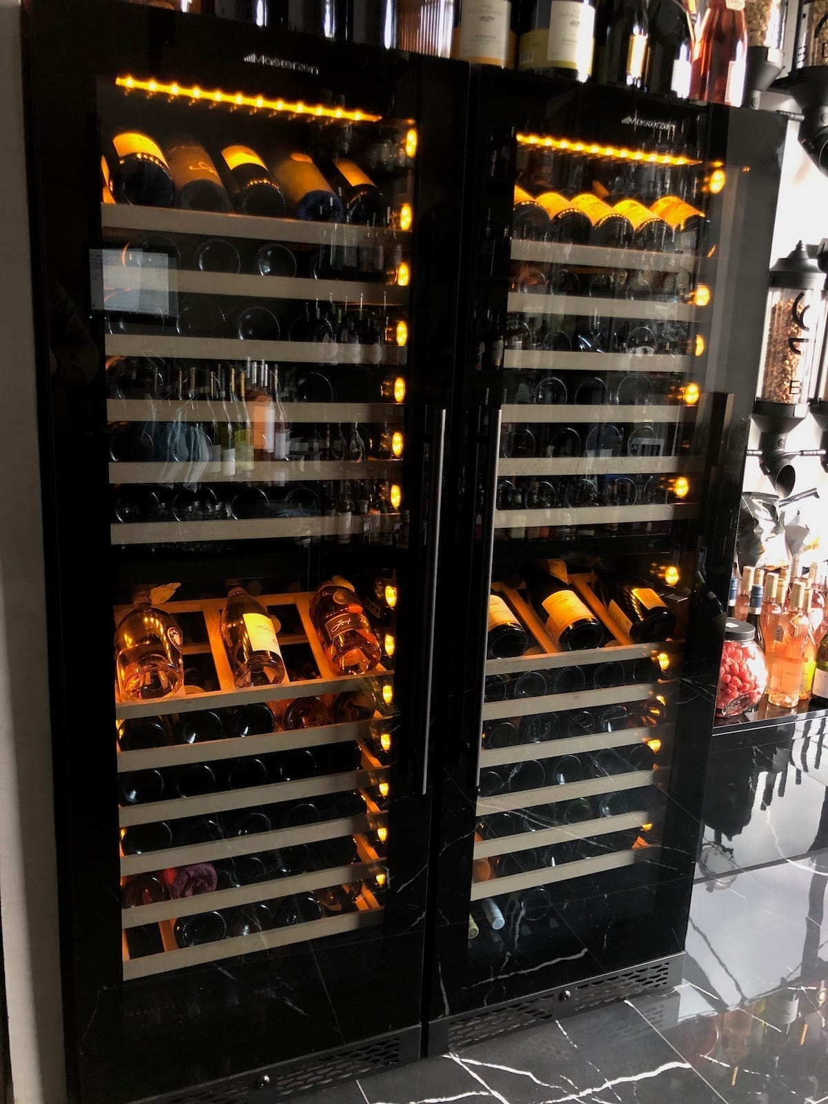 Για μεγαλύτερα μπουκάλια (και magnum) είτε τοποθετούνται στο κάτω μέρος, είτε πάνω και κάτω από το χώρισμα της ζώνης, είτε αφαιρείται εύκολα κάποιο ράφι ώστε να δημιουργηθεί χώρος και για μεγαλύτερα μπουκάλια. Είναι σημαντικό ώστε να μην χαλάνε οι ετικέτες και ζορίζονται ράφια και μπουκάλια/ετικέτες.